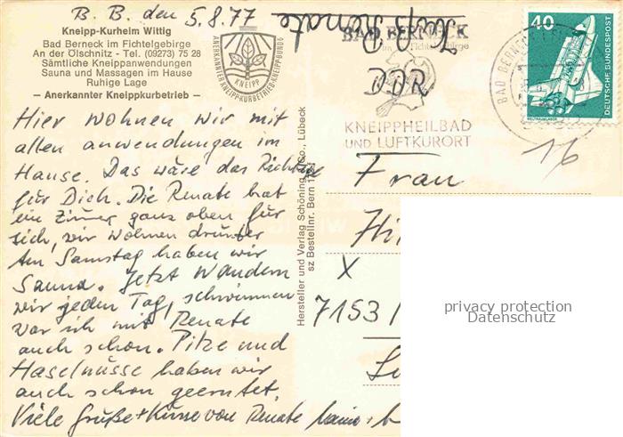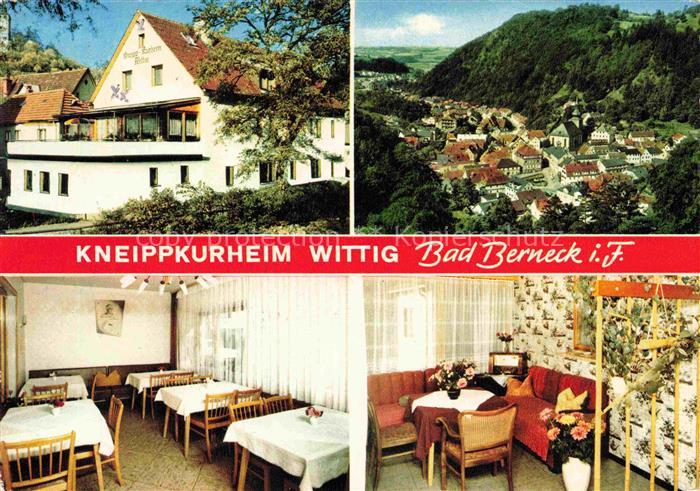 74100267 alte Postkarte Bad Berneck Kneipp-Kurheim Wittig Gastraum Ortsansicht mit Kirche postalisch gelaufen Erhaltung siehe scans [FriedD77] KatCode: 11110009472116