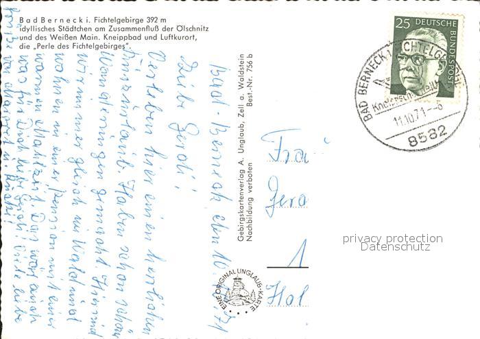 72470649 alte Postkarte Bad Berneck Panorama Park Altstadt Fachwerkhaus Schlossturm Luftkurort postalisch gelaufen Erhaltung siehe scans KatCode: 11110009472116