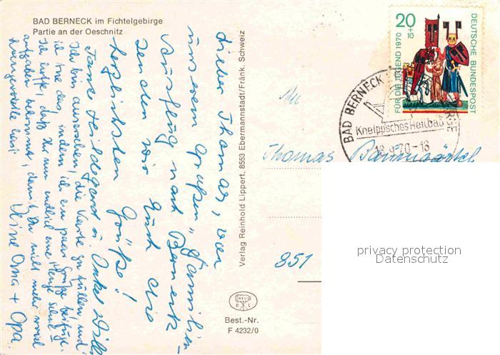 72764376 alte Postkarte Bad Berneck Partie an der Oeschnitz postalisch gelaufen Erhaltung siehe scans [AndreD76] KatCode: 11110009472116