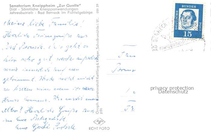74023139 alte Postkarte Bad Berneck Sanatorium Kneippheim Zur Quelle postalisch gelaufen Erhaltung siehe scans [WerneD78] KatCode: 11110009472116
