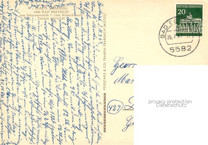 73304348 alte Postkarte Bad Bertrich Haus Dimmig Schwanenteich postalisch gelaufen Erhaltung siehe scans [FriedD77] KatCode: 11110007135501