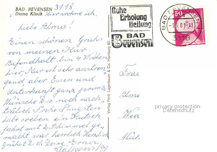 72727724 alte Postkarte Bad Bevensen Dianan Klinik postalisch gelaufen Erhaltung siehe scans [LiesaD40] KatCode: 11110003360002