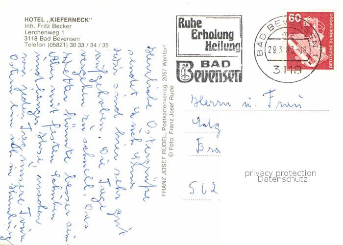72750387 alte Postkarte Bad Bevensen Hotel Kieferneck Restaurant Cafe postalisch gelaufen Erhaltung siehe scans [FriedD77] KatCode: 11110003360002