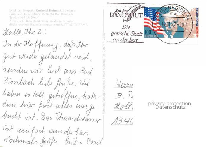 72841765 alte Postkarte Bad Birnbach Kurhotel Hofmark Birnbach postalisch gelaufen Erhaltung siehe scans [LiesaD40] KatCode: 11110009277113