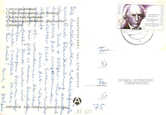 73841595 alte Postkarte Bad Blankenburg Am Griesbach FDGB Erholungsheim Am Goldberg Burg Greifenstein FDGB Urlauberwohnheim Magnus Poser Stadthalle postalisch gelaufen Erhaltung siehe scans [FriedD77] KatCode: 11110016073005