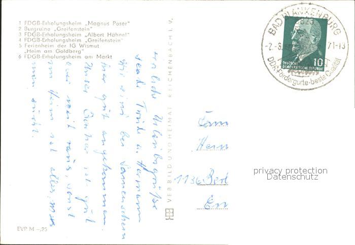 72343550 alte Postkarte Bad Blankenburg FDGB Erholungsheime Burgruine Greifenstein Ferienheim IG Wismut postalisch gelaufen Erhaltung siehe scans KatCode: 11110016073005