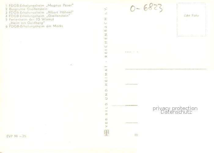 73044851 Bad Blankenburg FDGB Erholungsheime Magnus Poser Albert Haehnel Greifenstein Am Markt Burgruine Greifenstein Heim am Goldberg postalisch nicht gelaufen Erhaltung siehe scans [WerneD78] KatCode: 11110016073005