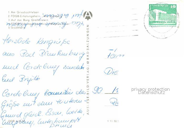 72730428 alte Postkarte Bad Blankenburg Griesbachfelsen FDGB Erholungsheim Burg Greifenstein FDGB Urlauberwohnheim Stathalle Wappen postalisch gelaufen Erhaltung siehe scans [FriedD77] KatCode: 11110016073005