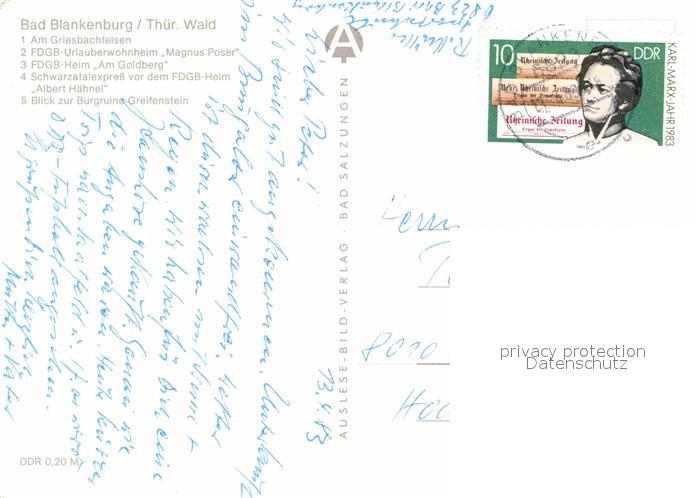 72627536 alte Postkarte Bad Blankenburg Griesbachfelsen FDGB Urlauberwohnheim Schwarztalexpress Burgruine Greifenstein Thueringer Wald postalisch gelaufen Erhaltung siehe scans [FriedD77] KatCode: 11110016073005