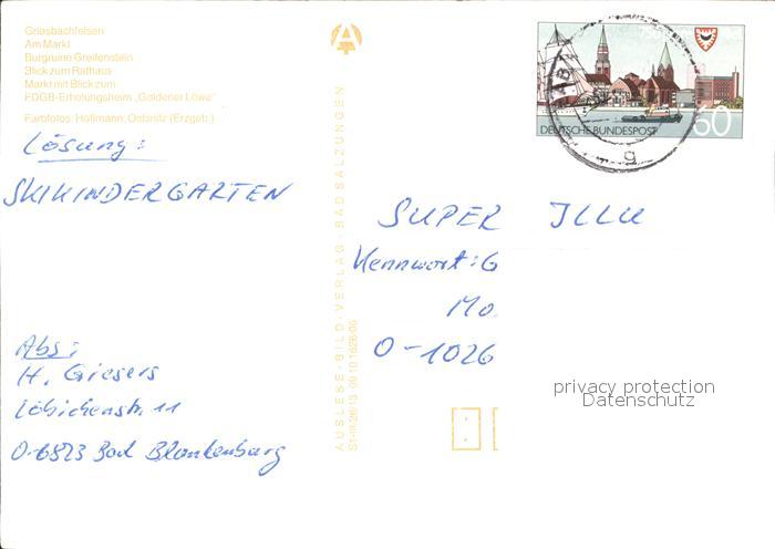 72276660 alte Postkarte Bad Blankenburg Markt Rathaus Burgruine Greifenstein postalisch gelaufen Erhaltung siehe scans KatCode: 11110016073005