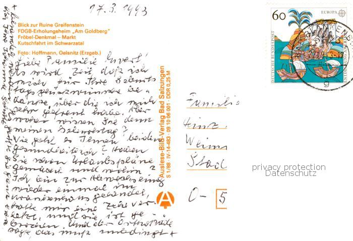 73842833 alte Postkarte Bad Blankenburg Ruine Greifenstein FDGB Erholungsheim Am Goldberg Froebel Denkmal Markt Kutschfahrt im Schwarzatal postalisch gelaufen Erhaltung siehe scans [FriedD77] KatCode: 11110016073005