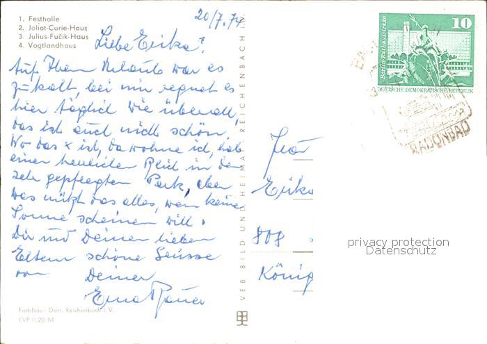 72410348 alte Postkarte Bad Brambach Festhalle Juliot Curie Haus Vogtlandhaus postalisch gelaufen Erhaltung siehe scans KatCode: 11110014178040