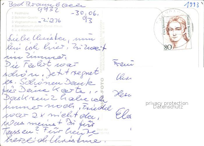72522749 alte Postkarte Bad Brambach Festhalle Schiller Quelle Vogtlandhaus Sanatorium Joliot Curie Haus Radonquelle postalisch gelaufen Erhaltung siehe scans KatCode: 11110014178040