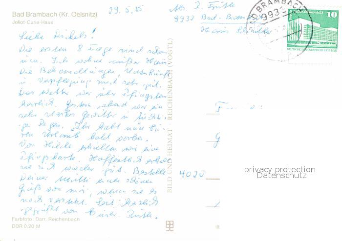 72721923 alte Postkarte Bad Brambach Joliot Curie Haus postalisch gelaufen Erhaltung siehe scans [LiesaD40] KatCode: 11110014178040