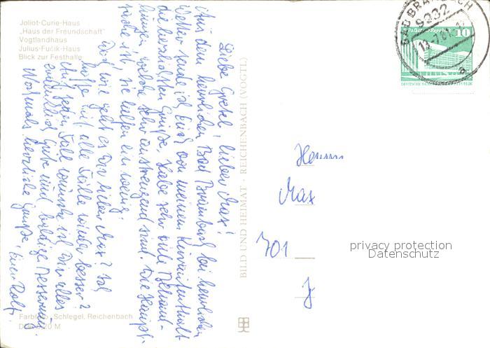 72325217 alte Postkarte Bad Brambach Joliot Curie Haus Haus der Freundschaft Vogtlandhaus Julius Fucik Haus Festhalle postalisch gelaufen Erhaltung siehe scans KatCode: 11110014178040