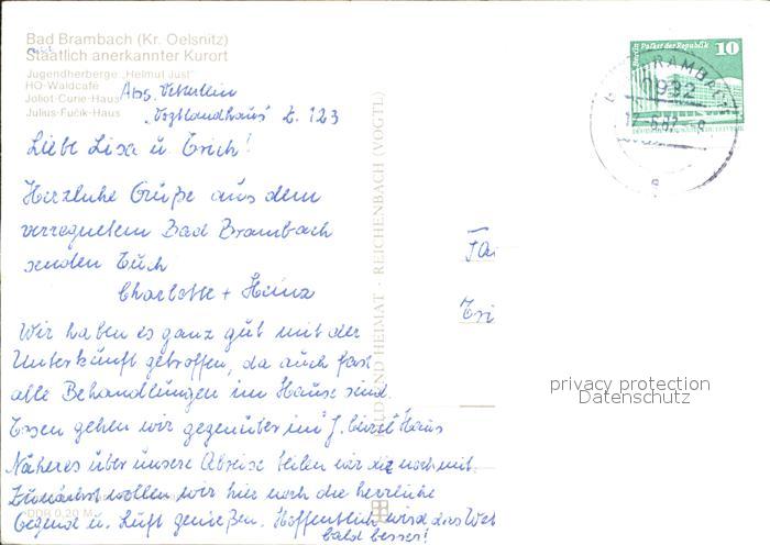 72325222 alte Postkarte Bad Brambach Jugendherberge Helmut Just HO Waldcafe Joliot Curie Haus Julius Fucik Haus postalisch gelaufen Erhaltung siehe scans KatCode: 11110014178040