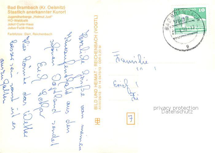 72972905 alte Postkarte Bad Brambach Jugendherberge HO Waldcafe Joliot Curie Haus Julius Fucik Haus postalisch gelaufen Erhaltung siehe scans [FriedD77] KatCode: 11110014178040