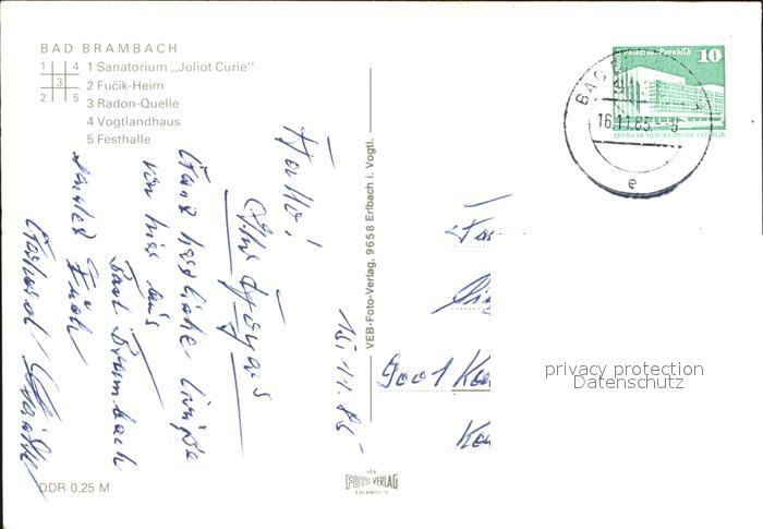 72386233 alte Postkarte Bad Brambach Sanatorium Joliot Curie Fucik-Heim Radon-Quelle postalisch gelaufen Erhaltung siehe scans KatCode: 11110014178040
