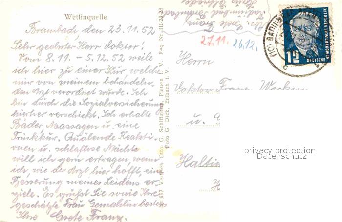 72646533 alte Postkarte Bad Brambach Wettinquelle Radiumbad postalisch gelaufen Erhaltung siehe scans [FriedD77] KatCode: 11110014178040