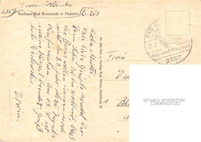 73142161 alte Postkarte Bad Bramstedt Kurhaus postalisch gelaufen Erhaltung siehe scans [FriedD77] KatCode: 11110001060004