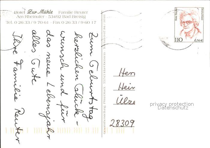 72413741 alte Postkarte Bad Breisig Hotel zur Muehle Rheinufer postalisch gelaufen Erhaltung siehe scans KatCode: 11110007131006