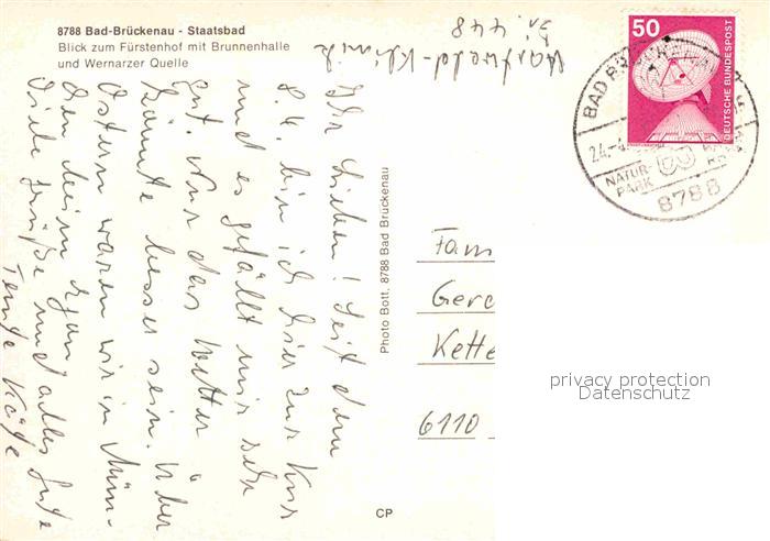72807466 alte Postkarte Bad Brueckenau Blick vom Fuerstenhof mit Brunnenhalle und Wernarzer Quelle postalisch gelaufen Erhaltung siehe scans [FriedD77] KatCode: 11110009672113