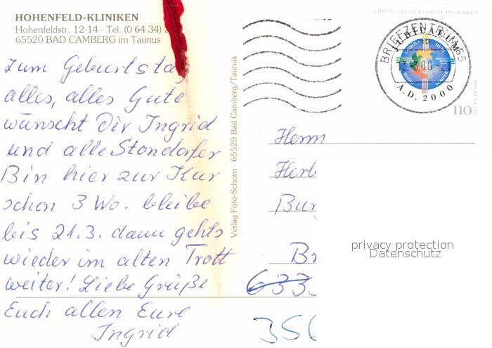 72857234 alte Postkarte Bad Camberg Hohenfeld-Kliniken postalisch gelaufen Erhaltung siehe scans [NatalD47] KatCode: 11110006533003