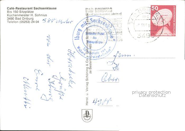 72016162 alte Postkarte Bad Driburg Cafe Restaurant Sachsenklause auf Iburg postalisch gelaufen Erhaltung siehe scans KatCode: 11110005762004