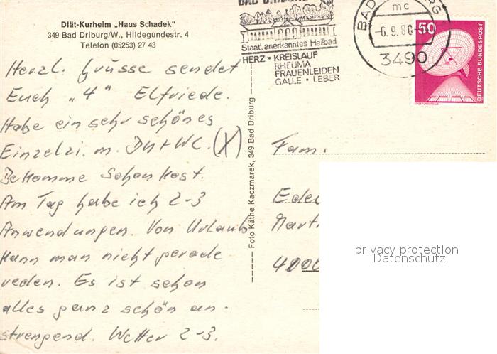 72989516 alte Postkarte Bad Driburg Diaet Kurheim Haus Schadek Zur Rosenmuehle postalisch gelaufen Erhaltung siehe scans [FriedD77] KatCode: 11110005762004