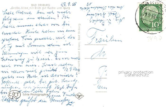 43345434 alte Postkarte Bad Driburg Grosse Allee mit Kirche und Burg postalisch gelaufen Erhaltung siehe scans [WerneD78] KatCode: 11110005762004