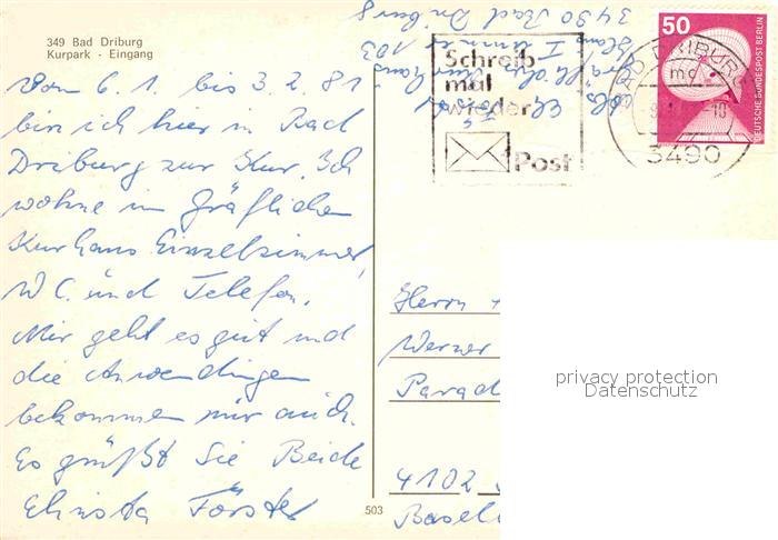 72740648 alte Postkarte Bad Driburg Kurpark Eingang postalisch gelaufen Erhaltung siehe scans [WerneD78] KatCode: 11110005762004