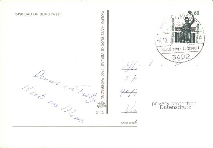 72416467 alte Postkarte Bad Driburg Kurpark Eingang Fussgaengerzone Kath Kirche Wandelhalle postalisch gelaufen Erhaltung siehe scans KatCode: 11110005762004