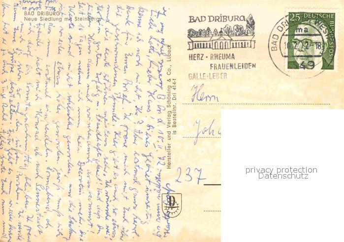 72761743 alte Postkarte Bad Driburg Neue Siedlung Steinberg postalisch gelaufen Erhaltung siehe scans [NatalD47] KatCode: 11110005762004