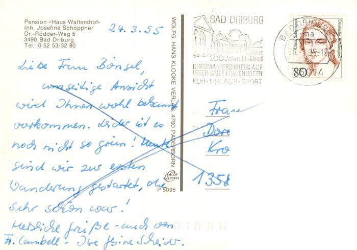 73943957 alte Postkarte Bad Driburg Pension Haus Waltershof postalisch gelaufen Erhaltung siehe scans [FriedD77] KatCode: 11110005762004
