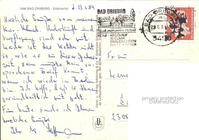 72332924 alte Postkarte Bad Driburg Suedviertel Fliegeraufnahme postalisch gelaufen Erhaltung siehe scans KatCode: 11110005762004