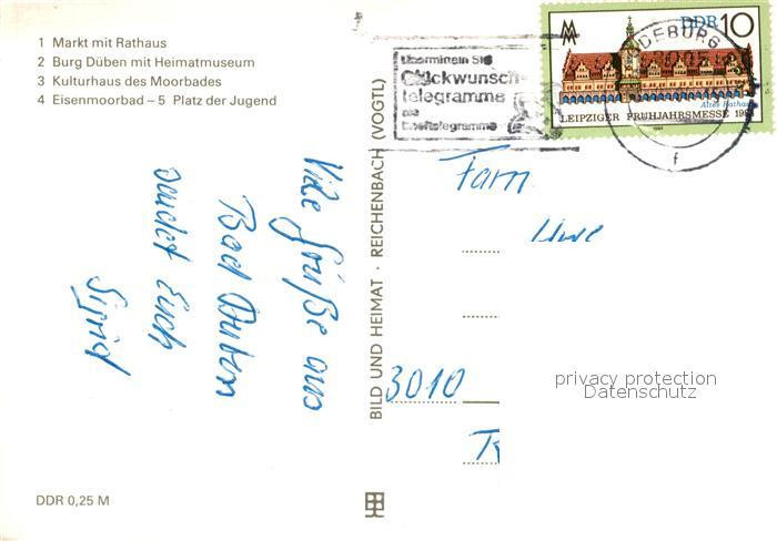 73044184 alte Postkarte Bad Dueben Markt Rathaus Burg Dueben Kulturhaus des Moorbades Eisenmoorbad Platz der Jugend postalisch gelaufen Erhaltung siehe scans [WerneD78] KatCode: 11110014374020