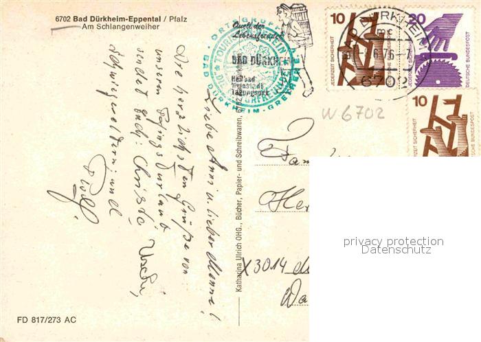 72883698 alte Postkarte Bad Duerkheim Am Schlangenweiher Details postalisch gelaufen Erhaltung siehe scans [WerneD78] KatCode: 11110007332002