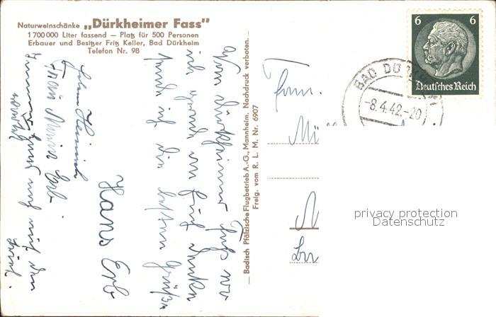 71941831 alte Postkarte Bad Duerkheim Duerkheimer Fass Naturweinschaenke Fliegeraufnahme postalisch gelaufen Erhaltung siehe scans KatCode: 11110007332002