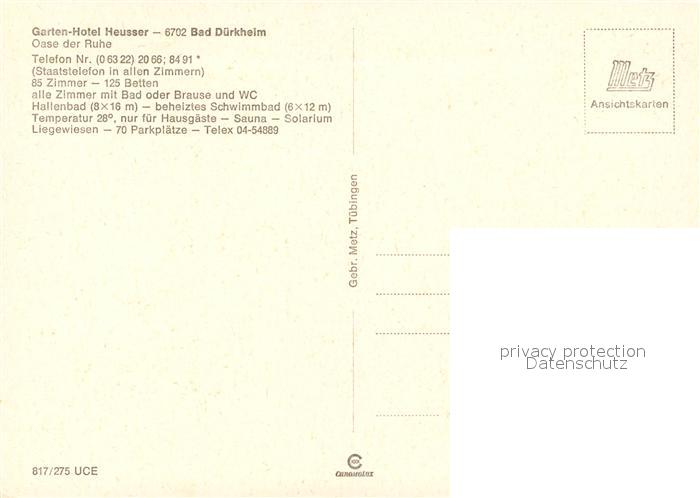 73174557 Bad Duerkheim Garten-Hotel Heusser postalisch nicht gelaufen Erhaltung siehe scans [LiesaD40] KatCode: 11110007332002