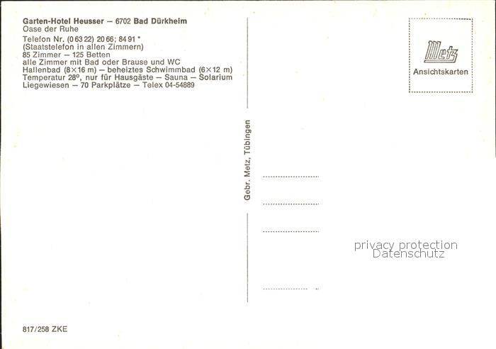 72287848 Bad Duerkheim Garten-Hotel Heusser postalisch nicht gelaufen Erhaltung siehe scans KatCode: 11110007332002