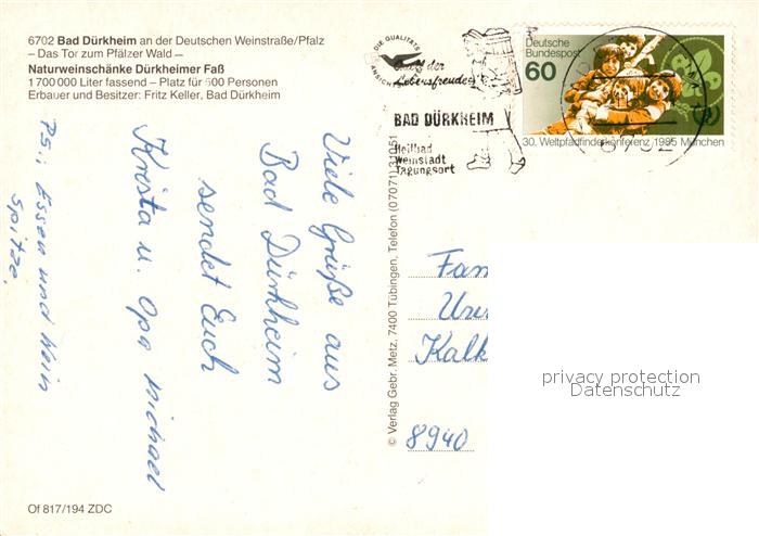 73123253 alte Postkarte Bad Duerkheim Naturweinschaenke Duerkheimer Fass postalisch gelaufen Erhaltung siehe scans [LiesaD40] KatCode: 11110007332002