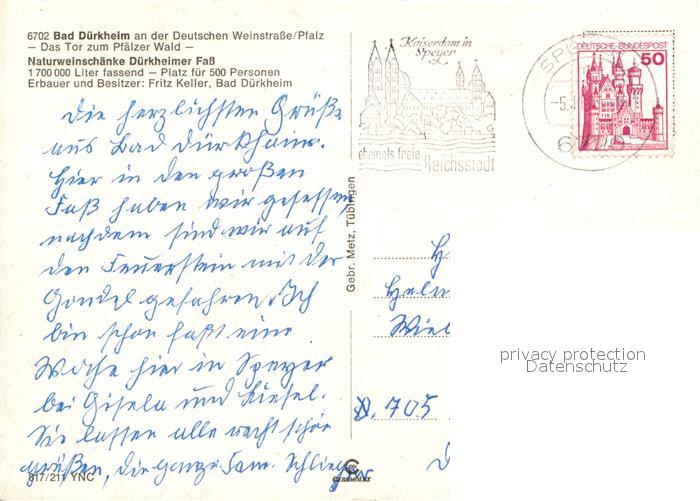 73018857 alte Postkarte Bad Duerkheim Naturweinschaenke Duerkheimer Fass postalisch gelaufen Erhaltung siehe scans [NatalD47] KatCode: 11110007332002
