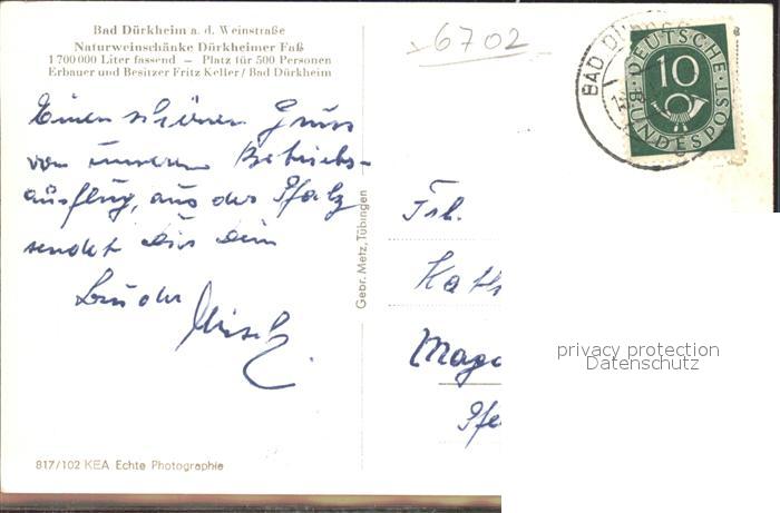 41753800 alte Postkarte Bad Duerkheim Weinstrasse Naturweinschaenke Duerkheimer Fass postalisch gelaufen Erhaltung siehe scans KatCode: 11110007332002