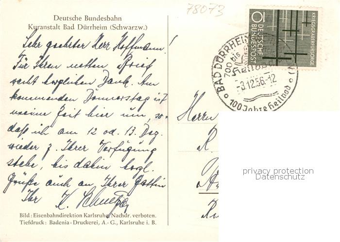 73853567 alte Postkarte Bad Duerrheim Deutsche Bundesbahn Kuranstalt postalisch gelaufen Erhaltung siehe scans [WerneD78] KatCode: 11110008326003