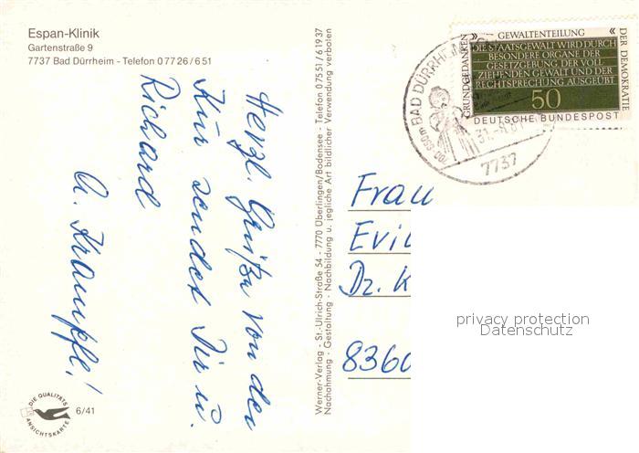72668426 alte Postkarte Bad Duerrheim Espan-Klinik postalisch gelaufen Erhaltung siehe scans [AndreD76] KatCode: 11110008326003