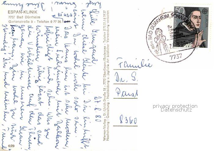 72667697 alte Postkarte Bad Duerrheim Espan-Klinik postalisch gelaufen Erhaltung siehe scans [AndreD76] KatCode: 11110008326003