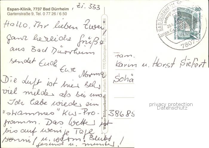 72542764 alte Postkarte Bad Duerrheim Espan Klinik postalisch gelaufen Erhaltung siehe scans [KathaD75 kv015box] KatCode: 11110008326003
