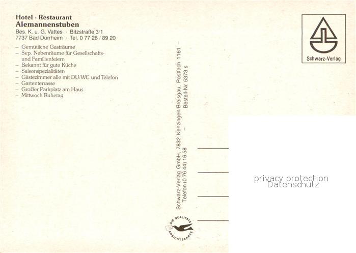 73722574 Bad Duerrheim Hotel-Restaurant Alemannenstube postalisch nicht gelaufen Erhaltung siehe scans [LiesaD40] KatCode: 11110008326003