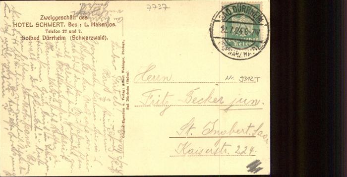 71033451 alte Postkarte Bad Duerrheim Hotel Schwert Wald Cafe postalisch gelaufen KatCode: 11110008326003