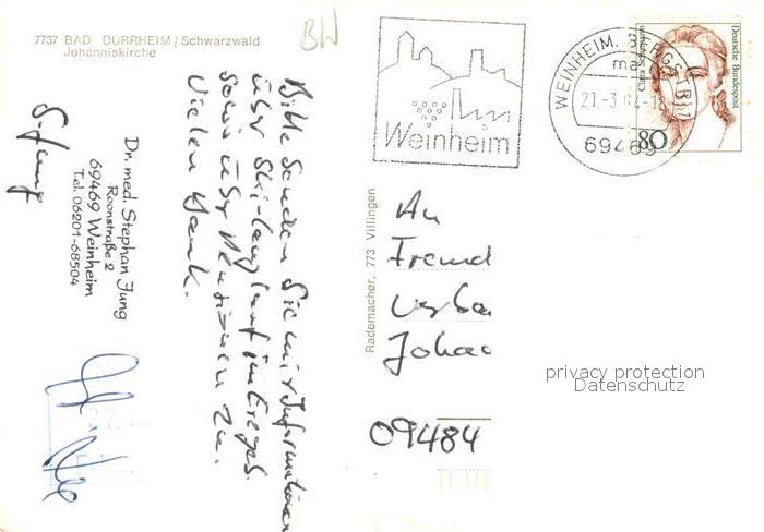 73035827 alte Postkarte Bad Duerrheim Johanniskirche postalisch gelaufen Erhaltung siehe scans [KathaD81] KatCode: 11110008326003